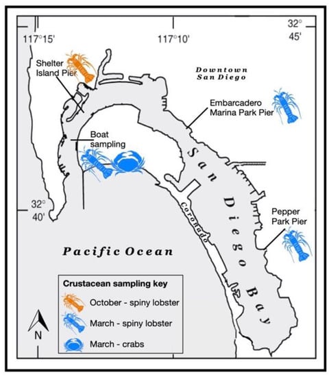 Crustacean shellfish were collected during the October 2018–March 2019 California spiny lobster season near three public fishing piers in San Diego Bay: Shelter Island pier, Embarcadero pier and Pepper Park pier. All three of these piers had been used as study sites in previous contaminant and fish consumption surveys [,,]. Crustaceans were collected using hoopnets deployed from Shelter Island pier in October (two spiny lobsters, P. interruptus) and from a boat near the pier in March (two spiny lobsters, one yellow rock crab (Metacarcinus anthonyii), one spider crab (also known as sheep crab, Loxorhynchus grandis)). Divers collected shellfish from beneath the Embarcadero and Pepper Park piers (three spiny lobsters each) in March 2019 (Figure 1). All crustaceans collected were at or near legal size limits of 82.5 mm carapace length for spiny lobster and 108 mm carapace width for rock crab (spider crab has no legal size) [] to gain a representative look at risks to recreational harvesters (Table 1).