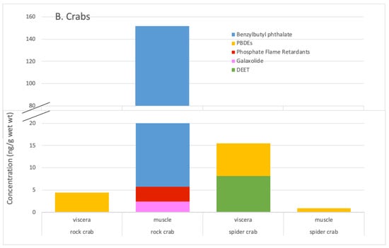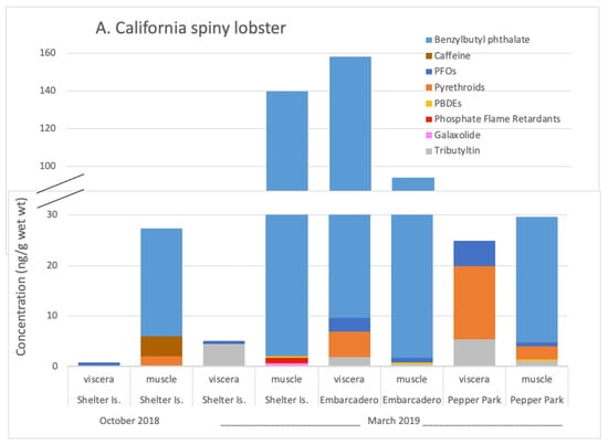 Although not as popular as spiny lobster, there are several species of crabs harvested and consumed from the bay and species differences in contaminant exposure, uptake and accumulation can be significant so that relying on the popular crustacean, spiny lobster, to be an indicator of contamination risks may not be sufficient. For example, in this study organotin, pyrethroid and PFOS were only detected in spiny lobster, not the crabs, while DEET was detected in only the spider crab. Differences across broader taxonomic groups may be even greater given that taxonomy may be linked to differences in morphology and physiology (e.g., lipid content, rates of metabolism), lifestyle (e.g., hard vs. soft substrate dwelling), feeding or other functional groups any of which may influence contaminant exposure, uptake, metabolism and accumulation rates (e.g., [,,,]). This makes the use of commonly used fouling filter feeding shellfish (e.g., mussel, oyster) as indicators even less reliable for indicating potential risks associated with crabs in San Diego Bay, which are bottom-dwelling predators (and occasionally scavengers) [,,,]. In a simultaneous study [], Pacific oyster from San Diego Bay contained many of the same contaminants in the crustaceans (benzylbutyl phthalate, chlordanes, Galaxolide, metals, PCBs, PDBEs, pyrethroids, tributyltin) and some not found in the crustaceans (neonicotinoid pesticides). However, several compounds were detected in the crustaceans that were not detected in Pacific oyster including caffeine, DEET, phosphate flame retardants and PFOS.