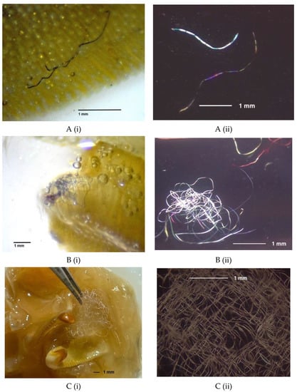 Every one of the 12 crustaceans collected from around the bay and examined (10 spiny lobster, 1 rock crab, 1 spider crab) contained pieces of anthropogenic debris and the number per individual ranged from 1–130 pieces. Most debris pieces were plastic as indicated by birefringence when viewed with cross-polarization (Figure 3A(ii),B(ii)) and/or strongly fluoresced under blue light when stained with Nile Red []. The exception was one bundle of 126 white/clear fibers found in the foregut of one of the spiny lobsters (Figure 3 C(i)) that did not stain with Nile Red dye and therefore did not fluoresce under blue light (Figure 3 C(ii)) nor have birefringence under cross-polarization (Figure 3 C(ii)). While this bundle was likely not plastic, it had also resisted hydrogen peroxide digestion and was therefore likely a durable natural textile fiber (e.g., cotton, wool).