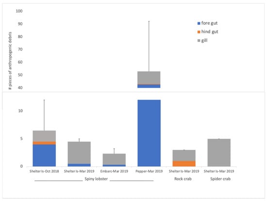 Seven of the ten lobsters had pieces of debris in gills (Figure 3A,B), six had debris in foregut (Figure 3C) and one had debris in hindgut. Both crabs had pieces of debris in their gills, one crab had debris in the hindgut and neither had debris in the foregut. Fibers were most common (Figure 3A–C), making up 67–100% of debris found in lobster and the crabs. Fibers were found in all body parts examined (fore, hind gut, gills), while hard pieces and film were only found in the gut. In three individuals, including those with the highest abundances of debris pieces, fibers were found in tangled bundles (it is unclear whether they became entangled in the organism or were introduced that way). One individual had a bundle of 126 fibers in its foregut (Figure 3C) and two individuals had bundles of fibers in their gills, one with three bundles (3, 5 and 8 fibers each) and the other with one bundle of 4 fibers (Figure 3B).