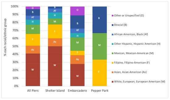 Most (41%) of the participants across all piers identified as white, Caucasian and/or of European descent, just under 20% each identified as Mexican and/or Hispanic and as Filipino and/or Filipino American, roughly 10% identified as Asian, Asian American and/or a specified Asian ethnicity, about 5% each identified as Black, African American and as Biracial and 3% said they were other or refused to specify (Figure 5). The proportions across piers were fairly similar to expected (p = 0.40, Chi square = 14.7, df = 14), with the greatest diversity at Embarcadero pier in terms of number of groups and evenness (Figure 5).