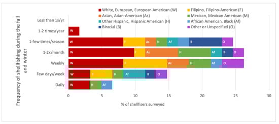 The frequency at which participants from each self-identified racial/ethnic group engage in shellfishing on three public piers in San Diego Bay during the fall and winter seasons (i.e., California spiny lobster season). Data are from fall 2018 to winter 2019, N = 61 surveys.