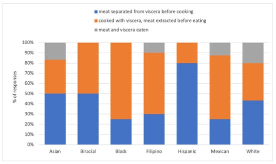 All shellfishers who eat harvested shellfish consumed muscle, in particular the tails of spiny lobster and claws of crab, while only 13% said that they ate viscera in some form (e.g., directly or cooked in a broth or puree/bisque) (Figure 7). Over half (58%) of participants cook the meat and viscera together whether boiling, frying, grilling or baking, while the other 42% separate the meat from viscera before preparation. Of the 58% who cook meat and viscera together, most (77%) extracted and ate only the meat after cooking. Age, average household income and self-identified racial/ethnic group (Figure 7) were not associated with a preference for preparing and eating shellfish (p ≥ 0.11, Chi square ≤ 2.7, df = 1–7, n = 56–60).
