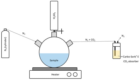 The bubbling and CO2 absorption method [] also enables the measurement of total 14C. The application of this method starts with the addition of 150 mL of H2SO4 1M to 100 mL of water. Then, the inorganic carbon in the form of bicarbonate or carbonate reacts with the sample, forming CO2 gas, which is collected into 10 mL of Carbo-Sorb® E and mixed with 10 mL of the Permafluor® E+ scintillation cocktail in a 20 mL glass vial, prior to its measurement with LSS. For determining 14C in its organic form, an oxidation step should be included, so 4 mL of KMnO4 0.02M is also added to the sample. A scheme of the bubbling and CO2 absorption system is shown in Figure 1.