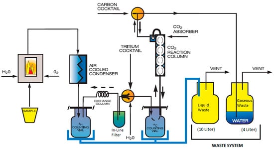 - Reagents of pro-analytical grade, which depend on the sample type and the analytical method to be applied: direct counting for water samples (when detection limits required > 2 Bq L−1), bubbling and CO2 absorption for water samples (when detection limits required < 2 Bq L−1) and combustion for solid samples.