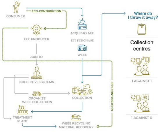 Figure 1 also shows that the citizens/consumers can confer their WEEE free of charge to the collection centres managed by the municipalities, preventing WEEE landfilling or disposing of it together with other urban waste. Citizens can also benefit from the “1 against 1” or “1 against 0” services managed by the retailers, i.e., if they confer their WEEE to the retailers when purchasing a new EEE (i.e., “1 against 1”) or not (i.e., “1 against 0”). The collective systems (consortia) help the EE manufacturers address responsibilities concerning the end-of-life operations of EEE until they are treated and transformed into secondary materials. The cost of the end-of-life activities performed by the collective systems is funded by the eco-contribution paid by the consumer when purchasing a new product (Figure 1).