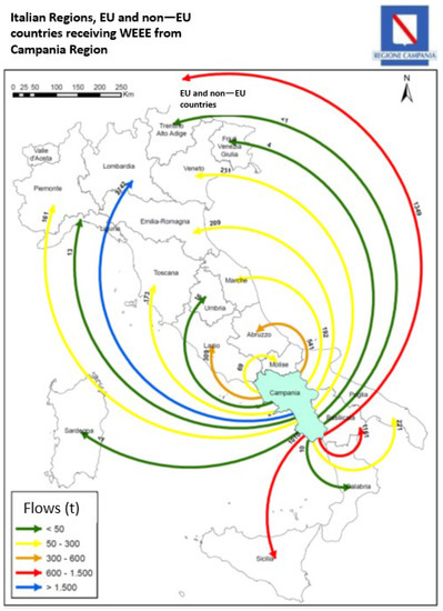 Campania Region, by means of its Regional Agency for the Protection of the Environment [53], has also set a monitoring system for tracking the inflows and outflows of WEEE of the Region towards the other Italian Regions, the EU, and foreign countries.
