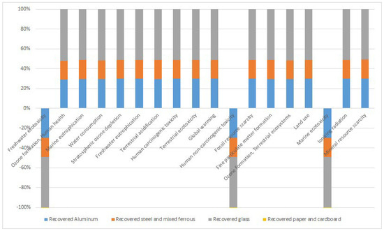 This stage identifies and calculates the environmental impacts (emissions) associated with each material flow recovered from the five WEEE groups (R1, R2, R3, R4, R5) in terms of the overall contribution provided by each WEEE category to the 18 environmental categories considered in the Impact Assessment Method used in this study (ReCiPe 2016 Midpoint [37]). The software used for LCA assessment based on primary and secondary data is OpenLCA 2.0 [38].