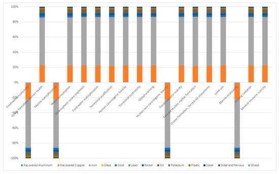 Table 3 presents the different environmental impacts of 1 kg of iron across the five WEEE groups due to the different treatment procedures. As shown in Table 2, iron is one of the metals recoverable in larger amounts than the other materials. The treatment of 1 kg of iron generates the highest impact in all R1 WEEE. For example, the Global Warming impact of iron is 0.0824 kg of CO2 eq, while the lowest environmental costs of iron treatment are found in R4 WEEE (−0.0063 kg of CO2 eq.), where the negative value refers to avoided impacts due to saved emissions in some steps of the process.