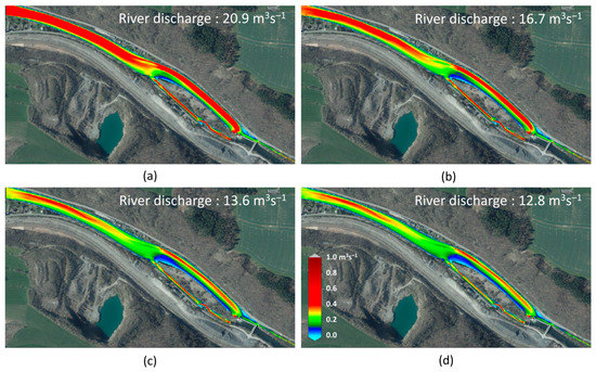 Specific discharges (coloured scale) of the simulated hydraulic scenarios at the Chanxhe hydropower plant used as boundary condition at the site entrance for each release event, (a) 1st release group, (b) 2nd release group, (c) 3rd release group and (d) 4th release group.