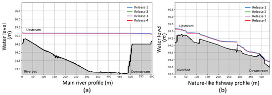 The topographic profile of (a) the main river and (b) the nature-like fishway from the upstream zone to downstream of the Chanxhe hydropower plant.