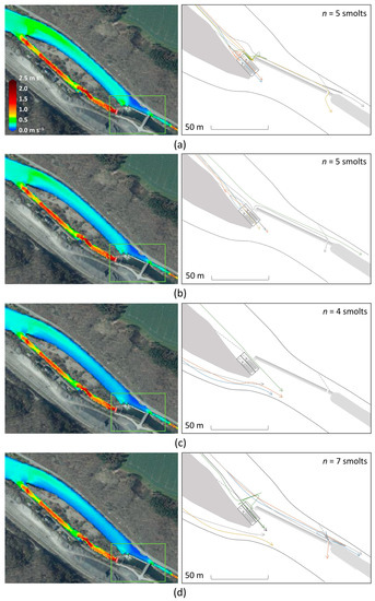 The factors that influence a smolt’s choice of a migration route are not well understood. Hydraulic conditions such as flow velocity and water depth will influence the smolt behaviour upstream of a migration barrier [29,30]. However, the relation between the fine-scale behaviour of the smolts and hydraulic conditions associated with mitigation measures is rarely identified [27,31]. Combining hydraulic modelling and smolts tracking provides a better understanding of how hydrodynamic conditions influence smolts’ behaviour upstream of migration barriers.