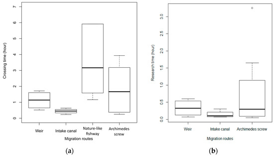 Behavioural metrics expressed by the smolts depending on the migration route used to cross the study site: (a) the crossing time and (b) the research time.