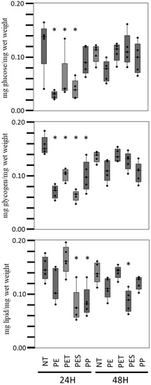 - Jiang, W.; Fang, J.; Du, M.; Gao, Y.; Fang, J.; Jiang, Z. Microplastics influence physiological processes, growth and reproduction in the Manila clam, Ruditapes philippinarum. Environ. Pollut. 2022, 293, 118502. [Google Scholar] [CrossRef] [PubMed]