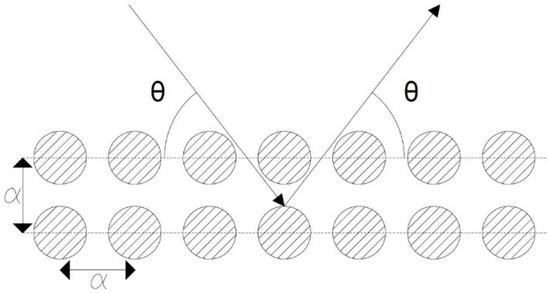 Schematic illustration of Bragg’s law with an incident wave at angle θ on a crystal periodic structure with lattice constant α.