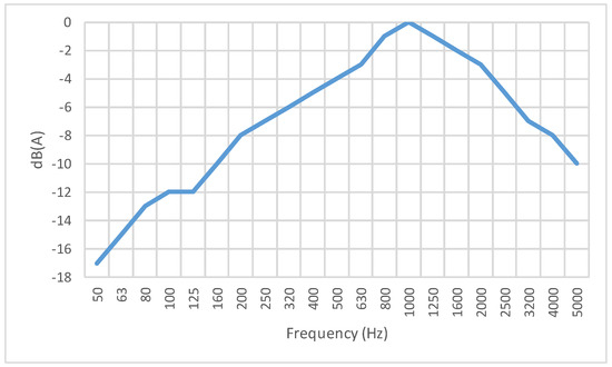 The main target application of the type of noise barrier under study is traffic noise mitigation, which is known to have particular relevance around the frequency of 1000 Hz. Indeed, international standards such as the ISO 717-1 [24] or EN 1793-3 [25] present the reference noise spectrum shown in Figure 2, where it is clear that the most relevant sound pressure levels occur between 630 Hz and 2000 Hz.
