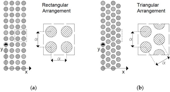 The simulations performed with the FEM models concerned the two types of scatterers’ geometrical arrangements, described before, namely with rectangular and triangular lattice distributions. In all cases, periodicity was considered along the longitudinal direction (y axis in Figure 5b). Below, some details of the 3D and 2D models are given.