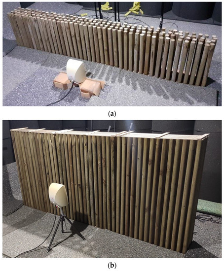 Small-scale sonic crystal noise barrier prototypes, made of wood logs, mounted in the acoustics laboratory of the DEC-UC: (a) barrier 0.6 m tall; (b) barrier 1.2 m tall.