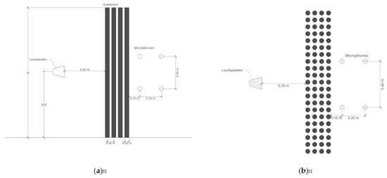 The sound source used in the laboratory tests consists of a loudspeaker, positioned at a distance of 35 cm from the barrier, centered with its height, and two sets of four receivers were defined for evaluation of sound pressure levels (SPL), with the microphones placed on the opposite side of the noise barrier. The first set of four microphones was placed 10 cm behind the barrier while the second set was placed 30 cm from the barrier; the height of the microphones was defined so that two of them were 15 cm below the center of the source, and the other two were placed 15 cm above it. Furthermore, in the direction parallel to the barrier, two of the microphones were placed at a distance of 20 cm to the right of the sound source axis and the other two were placed 20 cm to the left of the sound source axis. Average SPLs were evaluated using the eight measurement positions, and considering the scenarios with and without the sonic crystal barrier. Using the described setup, the insertion loss of the reduced-scale barriers was then calculated as the difference between both scenarios. In Figure 5, a schematic illustration of the experimental setup can be observed, through the lateral and plane layouts of the laboratorial tests for the case of the barriers that were 1.20 m tall.