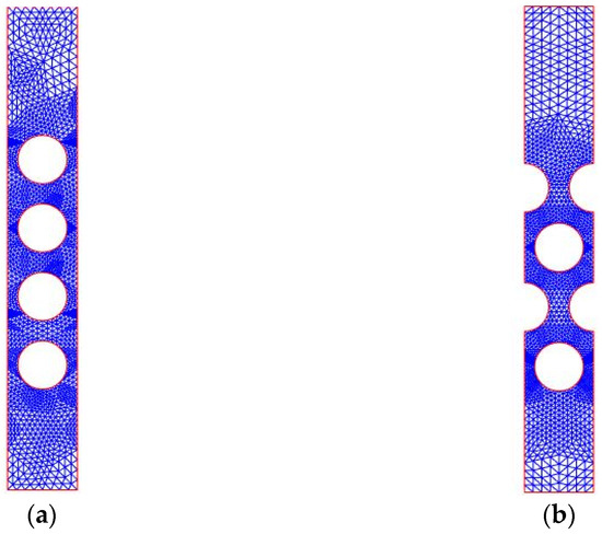 Discretization mesh of 2D FEM models: (a) rectangular, and (b) triangular geometric arrangements of sonic crystal elements.