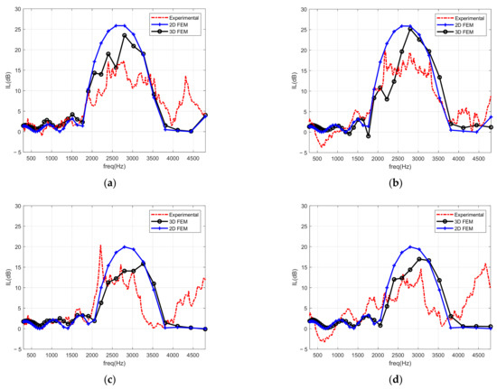 These laboratory prototypes are, as referred to, scaled-down representations of a real scale noise barrier (approximately at a geometric scale of 1:3), and were built using four rows of wooden circular poles, thus replicating the expected behavior of the real sustainable noise barrier. The IL acoustic performance provided by each of these prototypes was measured following the described procedure, and the experimental data were processed and compared with those of 2D FEM and 3D FEM models, both assuming that the crystal sonic noise barrier represents an infinitely long and periodic structure. Results from the experimental measurement and numerical modeling simulations are depicted in Figure 8, for the four reduced-scale cases. One should note that the frequency range indicated in the plots (300 Hz to 4800 Hz) corresponds to the real measurement range registered in the laboratory. Although the three approaches for evaluation of the IL have some fundamental differences (in terms of source type and 2D or 3D character), this comparison can be useful precisely to have a clearer view of what the differences are between the different models, and what the error committed is when the problem is simplified to 2D representation.