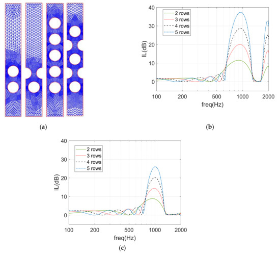 Different numerical simulations have been performed in the scope of this work, in order to complement existing results and analyses found in the literature regarding sonic crystal barriers. For that purpose, the 2D FEM model was initially used, simulating both the rectangular and the triangular sonic crystal arrangements, considering a lattice constant of 0.17 m. As for the reference results, numerical FEM simulations with two, three and four rows of cylindrical circular scatterers were performed, considering scatterers with a 12 cm diameter, and the corresponding insertion loss (IL) results are depicted in Figure 9. In Figure 9a, the finite element mesh used for the calculation of the cases of noise barriers with two and five rows of cylinders is illustrated, showing the increase in mesh density around the scatterers, in order to allow improved accuracy and a better reproduction of the circular geometry. On the other hand, Figure 9b,c shows the IL obtained for the rectangular and triangular sonic crystal arrangements. Analyzing Figure 9b, it becomes clear that a classical and well-defined structure of the IL curve is visible, with two significant IL peaks occurring around specific frequencies. These correspond to the band gaps described before, and the first occurs around f = c/2α ≈ 1000 Hz. As expected, the attenuation in this band gap successively increases with the number of rows, reaching around 38 dB for the periodic structure with five rows of scatterers. Similar behavior can be seen for the triangular arrangement, as depicted in Figure 9c, although it is interesting to note that lower values of the IL are achieved. These results are in line with the classical results found in the literature, such as in [11,29], and show that a barrier with four rows of cylinders can reduce sound pressure levels by more than 10 dB, in the ranges between 600 and 1200 Hz, for a rectangular arrangement of the sonic crystal (peaking around 30 dB), and between 750 and 1200 Hz, for a triangular arrangement of the scatterers (peaking around 20 dB). Indeed, both in terms of IL values and band gap width, the rectangular arrangement of the sonic crystal elements seems to allow a more interesting performance of the system.