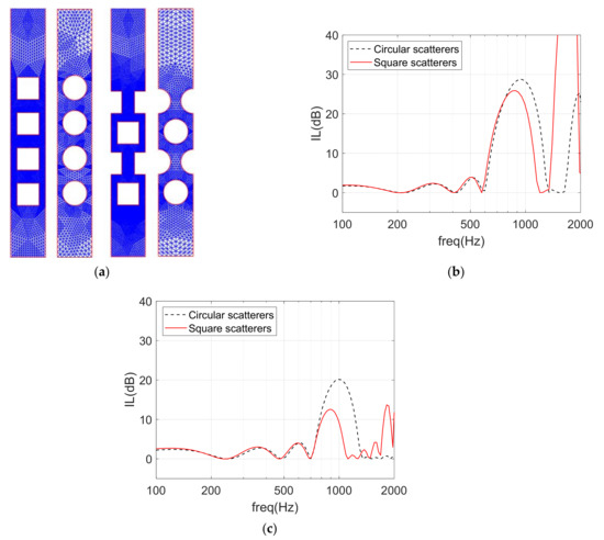 Effect of using square vs. circular cross-section scatterers in the sonic crystal noise barrier. (a) Meshes used in the numerical simulations; (b) IL curves computed for rectangular arrangements of the scatterers; (c) IL curves computed for triangular arrangements of the scatterers.