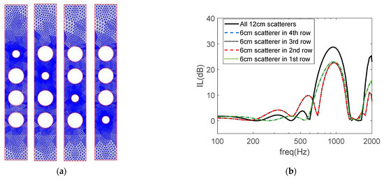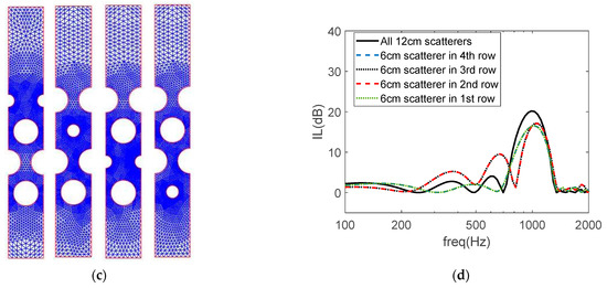 Effect of a different scatterer in one of the rows of the sonic crystal barrier. (a) Meshes used in the numerical simulations for rectangular arrangements of the scatterers; (b) IL curves computed for rectangular arrangements; (c) meshes used in the numerical simulations for triangular arrangements; (d) IL curves computed for triangular arrangements.