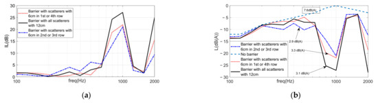 An additional set of numerical simulations was performed, aiming to better understand the possible effect of considering a different row of scatterers, either in one of the inner rows or in the extreme rows of the sonic crystal noise barrier. For that purpose, the sonic crystal configuration with circular scatterers with a diameter of 12 cm was analyzed, with a reduction in the scatterer diameter in one of the rows of the noise barrier to half the initial value (6 cm). This analysis was performed both for the triangular and for the rectangular arrangements of the sonic crystal scatterers. Figure 12 depicts the results obtained for the two types of arrangements, including the reference case (with all the scatterers of the sonic crystal with the same size). Observing these results, it is evident that, in all cases, the maximum value of the IL, occurring at the sonic crystal band gap, decreased by as much as 7 dB, for the rectangular arrangement of the scatterers, and by 4 dB, for the triangular spatial distribution case; the IL curves computed when the smaller scatterer was at one of the extremities of the sonic crystal seem to coincide almost perfectly, and so do the two curves computed when the smaller scatterer was in an inner row of the sonic crystal. However, it is interesting to note that, when the smaller circular element was inside the sonic crystal, a second IL peak seems to have appeared at lower frequencies, with a relevant attenuation magnitude (around 10 dB at 550 Hz, for the rectangular arrangements of the scatterers, and 600 Hz, for the triangular spatial distribution case), and also that at lower frequencies a small increase in the IL values also occurs. This effect can be important, since it may have allowed us to provide some additional (but significant) attenuation at frequencies otherwise unaffected by the presence of the sonic crystal noise barrier. To further clarify this effect, the IL curves computed in 1/3 octave bands (considering five frequencies per band) are represented in Figure 13a, for the three groups of curves, considering the rectangular arrangement of the scatterers; in addition, in Figure 13b, the normalized road traffic noise spectrum (as depicted in Figure 2) is displayed, together with the expected sound pressure level reduction provided by each of the sonic crystal noise barriers (calculated, at each frequency, by subtracting the IL values from the corresponding traffic noise spectrum values). It may be inferred that the effect, at lower frequencies, is not negligible, and may be useful in some cases to allow some additional control at lower frequencies. The global value of the A-weighted sound pressure level parameter, LAeq (in dB(A)), has been computed considering just the 1/3 octave frequency bands between 100 Hz and 2000 Hz, and it is displayed also in association with each of the depicted curves, showing that, however, almost no global reduction (around 0.2 dB(A)) is provided by including a different scatterer row.