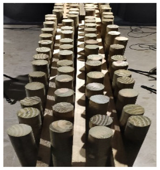 An important effect that occurs when using natural materials, as it is the case in the present work with timber logs, is that, despite any wooden surface treatments, some random variations may occur from scatterer to scatterer, since wooden elements may vary their size non-uniformly due to temperature and moisture content, or they may even initially present some slight deviations. In addition, it is common that the implementation of a given solution in a construction site may suffer with defects and misalignments in the positioning of the different elements of the noise barrier. In this regard, Figure 14 illustrates one of the sonic crystal specimens built in the laboratory, with the wooden scatterers exhibiting large deviations from the originally designed alignment. To assess the relevance of such effects, numerical simulations have been performed considering random variations of the scatterer diameter and of the distance between rows. As a reference, the rectangular arrangement of the scatterers with four rows has been analyzed. One should notice that the position and the diameter of the scatterers is kept constant throughout each row, thus keeping the periodicity along the longitudinal direction of the barrier.