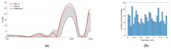 (a) IL variation range resulting from randomization of scatterer diameter (ranging from 9 to 12 cm); (b) histogram of the diameter variation throughout the 100 random cases.