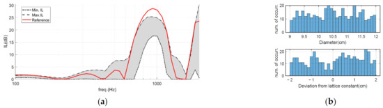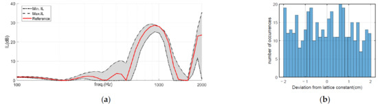 Figure 15a illustrates the IL variation range achieved by the sonic crystal noise barriers when the diameter of the scatterers is allowed to vary up to 3 cm from the reference 12 cm diameter value. In total, 100 cases were run, considering that this random change occurs at each scatterer independently (in fact, because of the periodicity of the system, this occurs at each row of scatterers independently). On the other hand, Figure 15b presents a histogram showing the diameter randomness throughout the whole set of simulations. Observing the IL plot (Figure 15a), it is possible to conclude that the randomness of the scatterer diameter indeed may affect the acoustic behavior of the sonic crystal structure, up to a point of reducing the peak IL value around 10 dB when compared to that of the reference case (all scatterers 12 cm in diameter). Interestingly, outside the sonic crystal band gap the behavior is less predictable, with some IL improvements occurring for the maximum IL curve. This is in line with the behavior occurring when one different scatterer is introduced, as described before. In Figure 16, the effect of randomness in the spacing between rows of sonic crystal elements (deviations of up to 2 cm from the expected position) is shown, revealing an interesting acoustic behavior. Indeed, for this case, significant positive effects are registered, indicating that, in some cases, some randomness may even be beneficial to the acoustic attenuation performance of the noise barrier. For this case, the reference curve lies within the envelope of the randomly tested cases. Finally, Figure 17 illustrates the joint effect of both randomizations (scatterer diameter and positioning), revealing a very large envelope of possible IL values at mid and high frequencies.