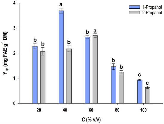 The initial stage in the organosolv process development was to identify a water/alcohol proportion that would enable increased recovery of oat polyphenols. For this purpose, a screening was performed using water/alcohol mixtures with variable compositions (Figure 1). For the mixtures of 1-propanol/water, a 40% (v/v) solution was shown to provide the highest YTP, which was significantly different (p < 0.05). On the other hand, the most efficient polyphenol recovery was accomplished with 2-propanol/water mixtures of 60% (v/v), whereas the 40% mixture was of significantly lower efficacy. Based on this outcome, 40% solutions of 1-propanol and 60% solutions of 2-propanol were selected for further testing.