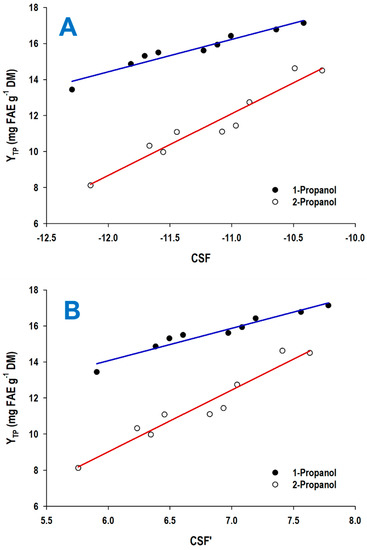 Linear regressions describing the correlation of the yield in total polyphenols (YTP) with the combined severity factor (CSF) (A) and the alternative combined severity factor (CSF′) (B).
