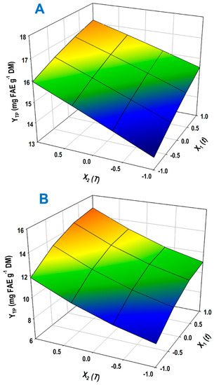 The use of Equation (6) enabled the determination of the theoretically maximum YTP that could be achieved, which was 17.25 mg FAE g−1 DM. Similarly, the use of Equation (7) gave a theoretical maximum YTP of 17.28 mg FAE g−1 DM. Both values were virtually identical to the experimental value of 17.14 mg FAE g−1 DM (Table 2). In the same manner, the theoretical maximum values of YTP computed from the Equations (8) and (9) were 14.57 and 14.63 mg FAE g−1 DM, respectively, which perfectly matched the experimental value of 14.50 mg FAE g−1 DM. These findings strongly indicated that, using the empirical models established, reliable predictions on YTP could be generated based on any combination of T and t within the ranges tested.