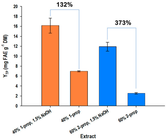 Conventional solvent extraction of various milling fractions of oat did not provide yields higher than 1 mg gallic acid equivalents g−1 DM [38], while extraction with supercritical fluids was of even lower efficacy, giving a maximum yield of as high as 0.89 mg gallic acid equivalents g−1 DM [39]. Comparable levels of 0.84 mg gallic acid equivalents g−1 DM were also achieved through solid-state fermentation of OB [40]. Therefore, to the best of the authors’ knowledge, the YTP achieved by the 1-propanol/sodium hydroxide treatment represents the highest level reported.