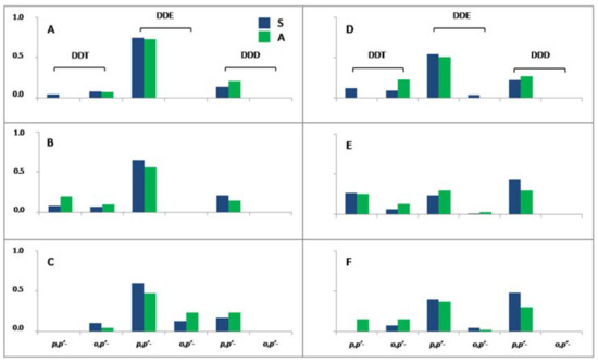 The relative contribution profiles of DDT and its breakdown products in all six surficial sediment analyzed, sampled in spring (S) and autumn (A).