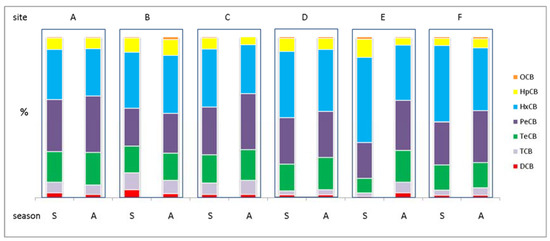 Taking into account the chemical and physical properties of this complex class of compounds (Henry’s constant, octanol-water partition coefficient, water solubility), it might be appropriate to investigate the ratio between specific congeners, as is the practice for polycyclic aromatic hydrocarbons. Sometimes, variations in the compositional pattern could highlight a change in the source composition, in addition to those due to environmental processes. The low-chlorinated congeners, 28 and 52, tend to be more easily dispersed to the atmosphere. In fact, they are more volatile, water-soluble, less linked and less bound to the suspended particles in a body of water. As a result, they are more easily remobilizable from the sediment. In contrast, the other five mid-chlorinated congeners are strongly bound to sediment particles. Consequently, the concentration ratio between these two groups of congeners could be a practical index for the assessment of distance and pathway contamination [57]. For this ratio, lake Piediluco sediment has values between 0.10 and 0.38 (average 0.26 ± 0.08), confirming the predominance of more hydrophobic congeners (probable point source of PCB contamination), rather than from atmospheric transport from the two hydroelectric plants, downstream of the Marmore falls and fed by the waters of the lake. For completeness, Figure 3 shows the comparative percentage composition of the eight chlorination groups, relating to the two seasons for the six sampling stations.