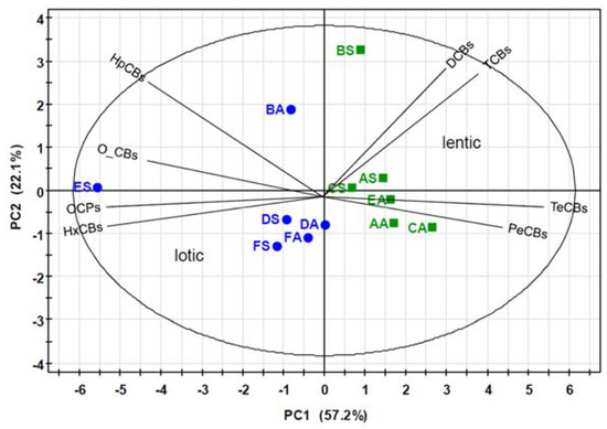 Score and loading plot of samples and variables in the dimensional space of factors 1 and 2, obtained by the PCA of the concentrations of PCB homologs (D, T, Te, Pe, Hx, Hp and OCBs) and those of total organochlorine pesticides (OCPs). (Blue dots for sites with lotic status; Green square for sites with lentic status).