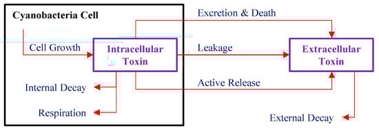 It is assumed that during cellular respiration, when the cells release carbon dioxide [28], the cells may use the toxin for cell processes, thereby decreasing the amount of intracellular toxin while not adding to the amount of extracellular toxin. It is also assumed that during excretion, when the cells release nutrients and organic carbon [28], the cells may also release toxins to the water column, thereby adding to the extracellular toxin concentration and decreasing the intracellular concentration. Internal decay, leakage, and active release are other hypothesized processes that might occur. Referring to Figure 1, it is assumed that for a specific toxin in a batch reactor, the sources and sinks of intracellular toxin concentration can be modeled by Equation (2), and the sources and sinks of extracellular toxin concentration can be modeled by Equation (3)