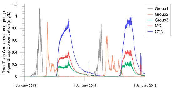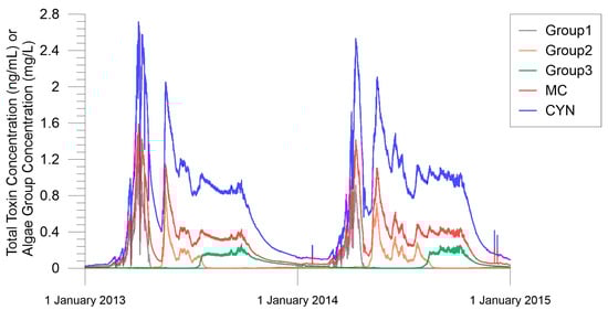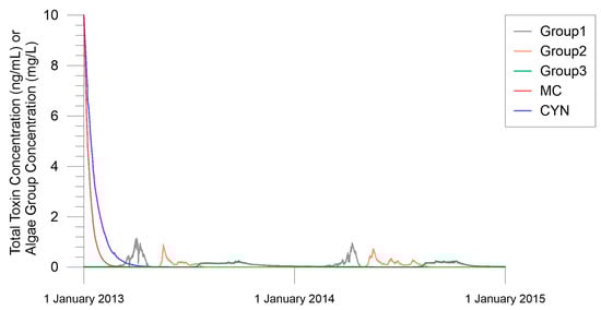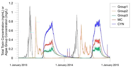 There were minimal toxin data available at the lake, so the model was only used to test the proof of concept of the toxin equations within the code. Two toxins (MC and CYN) were included in the model simulations to test the model’s ability to predict multiple toxin concentrations and to test the toxin dynamics between MC and CYN. The model was set up using three algal groups where group 1 represented cooler temperature algal species (diatoms), group 2 represented warmer temperature algal species (greens), and group 3 represented cyanobacteria.
