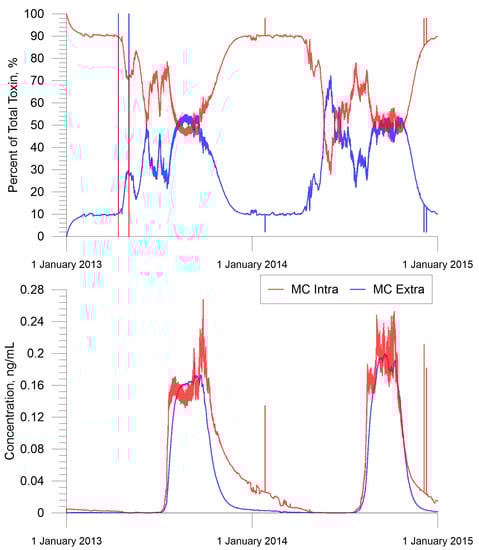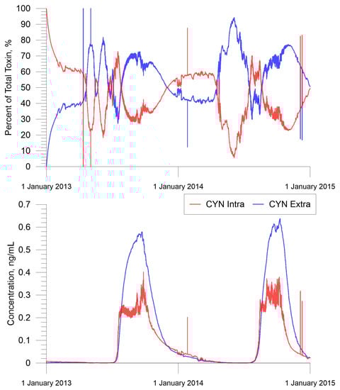One of the difficulties with predicting cyanotoxin concentrations is that not all toxic cyanobacteria may produce toxins in all environments, and some species include both toxic and nontoxic cyanobacteria strains [9,12,13]. Additionally, some strains may be capable of producing multiple different toxins. A study by Ballot et al. [15] detected both microcystin and anatoxin-a in one strain of Arthrospira fusiformis. The toxins can be present as intracellular toxins (toxins bound within a cell) or extracellular toxins (dissolved in the water). Cell lysis is one of the pathways by which cyanotoxins become extracellular, and some studies have also suggested that release from live cells may also occur. The active release is thought to occur for some CYN-producing species due to the high extracellular concentrations that have been observed [16,17], whereas cell lysis is likely the main cause of extracellular microcystins [18]. However, the overall quantity of toxins present in a water body appears to be largely a factor in the overall abundance of the particular cyanobacteria strains present producing the toxins [9].