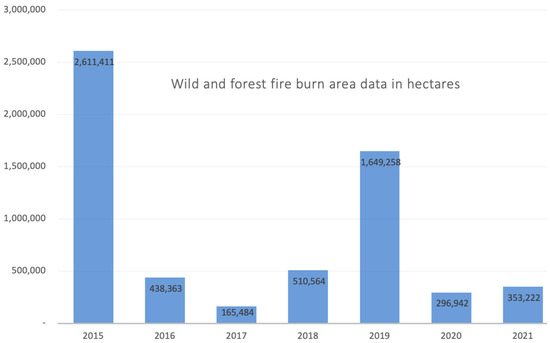 - Statista Research Department. Area Burnt by Forest Fires in Indonesia 2015–2021. Available online: https://www.statista.com/statistics/1083530/indonesia-area-burnt-by-forest-fires/ (accessed on 19 January 2023).