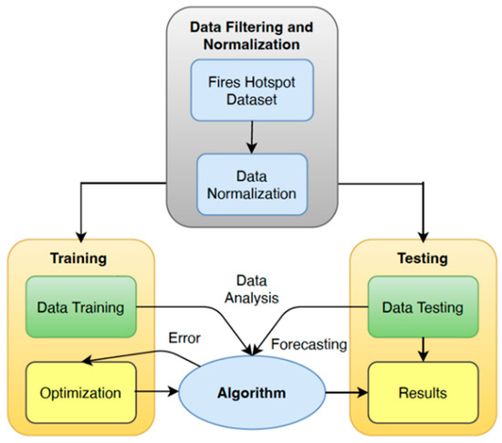 Referring to the collected dataset of more than 11,000 fire hotspots from the year 2010 to 2022, the first process is data filtering and normalization, deleting incomplete datasets or normalizing data to achieve a complete dataset. The grouping process resulted in total data to become 4213 datasets, as presented in Table 2, for the further machine learning process in data mapping and forecasting. The training data has a massive portion compared to the testing data, accounting for 80% of the total data used for training and then only 20% for testing data, as shown in Figure 2. The amount of training data is greater than the testing data in order to achieve high-accuracy decisions using the machine learning process. To evaluate the process and results obtained and then enhance the performance as well as the accuracy of forecasting data by minimizing the error in the results, an error calculation is used to check the percentage, to ensure that the error is below 10% as a normal indicator for data analysis error.