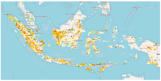 The mapping and forecasting results of fire hotspots, as referred to NASA Earth data, started in the year 2010, complete with coordinates (latitude and longitude), date and time, the confidence level of the hotspot, and other indicators detected as previously shown in Table 1. In this research, analysis of only four indicators is used for further processing, namely, the acquisition date (acq date), the coordinates, and the confidence level. The spreading of hotspot levels is classified into five categories or levels of confidence. This method is implemented to verify which fire hotspot has a high-risk occurrence of forest fires and which among them is at low risk without much impact. The five levels of classification from the top level are as follows: 81–100, indicated as red dots; 61–80, indicated as orange dots; 41–60, indicated as yellow dots; 21–40, indicated as green dots; and 0–20, indicated as blue dots. Figure 6 represents the results of mapping the distribution of fire hotspots in Indonesia for the year 2022 and year 2010 to 2021 as in Appendix A. Overall, the hotspots are more concentrated in Sumatra and Kalimantan. As a result, these islands present a higher risk of forest fires because of their geography and land type. Ultimately, the best strategy is to conduct a prediction based on the current history data along with forecasting to alert the government, respective institutions, and communities. The dotted shows in the map consist of 5 types which from green color for the lower risk of fire to the blue, yellow, pink and red color indicate the highest potential of forest fire risk with percentage from 80 to 100.