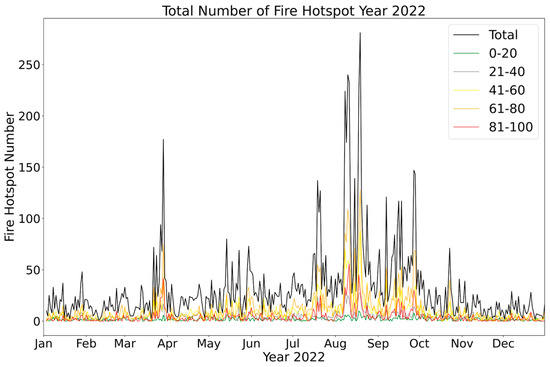 The total number of hotspots detected is categorized into five levels for specific evaluation; all the fire hotspots refer to earth data in Indonesia that have counted thousands of hotspots in accumulated time over a 10-year period. In this work, all the hotspot data are plotted onto a graph annually for a detailed presentation indicated by level, starting from January until December every year. Figure 7 shows the monthly distribution of hotspots for every level for the year 2022 and the years 2010 to 2021 as in Appendix B, where the black line represents the total number of hotspots. In general, the pattern and distribution of hotspot incidents are similar for most of the year and increase at the end of the year from September to December due to summer or the dry season, while earlier on, the number of hotspots looks normal. The maximum number of hotspots detected is between 600 and 700 for the peak season at the end of the year. The study is in the location of Indonesian territory with borders in latitude 5.980133, 94.964324 and −10.537824, 94.964324 on the west and in the east with 5.980133, 141.105341 and −10.537824, 141.105341.