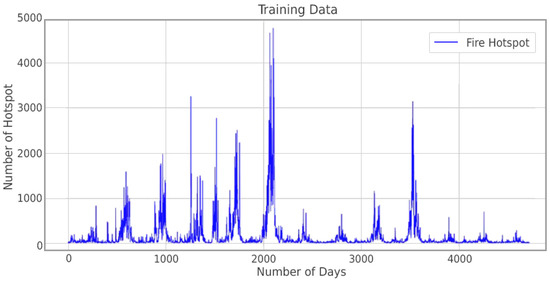 The dataset of wildfire hotspots in this analysis was obtained from NASA’s MODIS hotspot in Indonesia. Indicators in the dataset consist of 15 variables, and all the indicators are valuable for the analysis. The NASA Earth dataset is collected based on the image from the satellite to detect the active hotspot from the satellite station, because of the distance, whereas in some cases the quality of the image may have low quality and the hotspot is not counted in the number and is also affected by the total number of fire hotspots to be analyzed and forecasted. Then again, some sets of data that are missing due to complex parameters of earth data then strategize to overcome and complete the set of data by using the algorithm and predicting the missing database on training from the previous dataset. In this analysis and forecasting, only complete data achieve accurate prediction and determine the hotspot’s location. Hotspot data in Indonesia—with a total of more than 11,000, as shown in Table 1—result in a highly accurate decision because of a high number of set data. The total data were collected in 10 years, from 2010 to 2022, and forecasted for the year 2023 [22]. Table 2 presents a set of NASA earth data after filtering, selecting only four parameters from 2010 to 2022 for analysis.