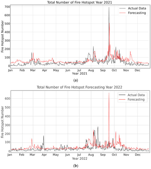 Comparison of actual fire hotspot data and forecasting for the year (a) 2021 and (b) 2022.