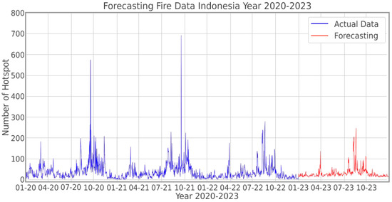 The LSTM model in the RNN algorithm has been applied in this analysis, and the results achieve a minimum error in time series of data. The proposed algorithm works fine in predicting and forecasting fire hotspot data for the future, i.e., in 2023. The actual data plotted as a graph in Figure 9 show that the behavior and pattern of data occurrence are similar. With reference to the results, the error bears a low percentage, and the mean proposed algorithm matches to the case in forecasting forest fire hotspots. The result of the forecasting shows a similar pattern to the previous fire hotspots number and trend as well as the monthly distribution. The use of this model yields high accuracy with an error rate of less than 10% compared to other traditional methods. Furthermore, this forest fire analysis and forecasting in the Indonesian region engages only a few researchers and the case categories occupy a specific case, as in tropical regions, as well as the typical land and contour. Future research will seek to identify and verify the achieved results and compare them with the uncontrolled external factors in this decision. Other parameters that may influence the decision of the system may be considered as well to achieve high accuracy and fast processing of the results.
