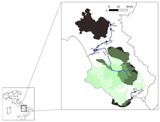 Map of sampling sites on Bussento River, Sele River, and Calore River. Site code refers to Table 1. Green background indicates Cilento, Vallo di Daino, and Alburni National Park (PNCV). Dark areas indicate SICs and ZPSs (Special Protection Zones) included in the sampled basins.